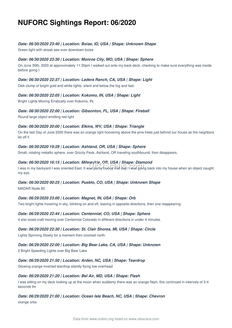 NUFORC Sightings Report: 06/2020