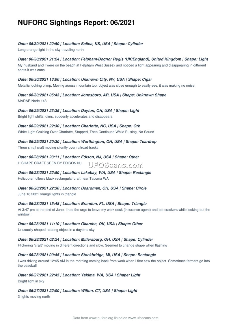 NUFORC Sightings Report: 06/2021
