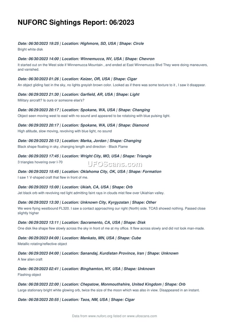 NUFORC Sightings Report: 06/2023