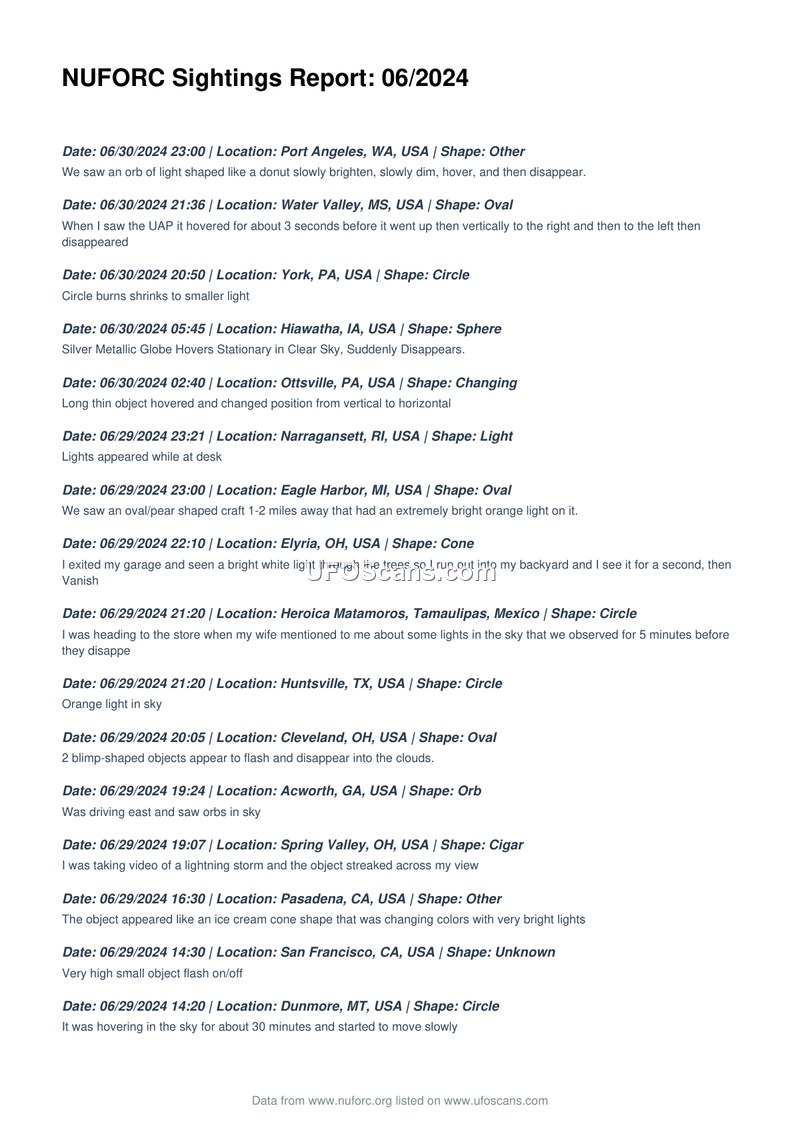 NUFORC Sightings Report: 06/2024