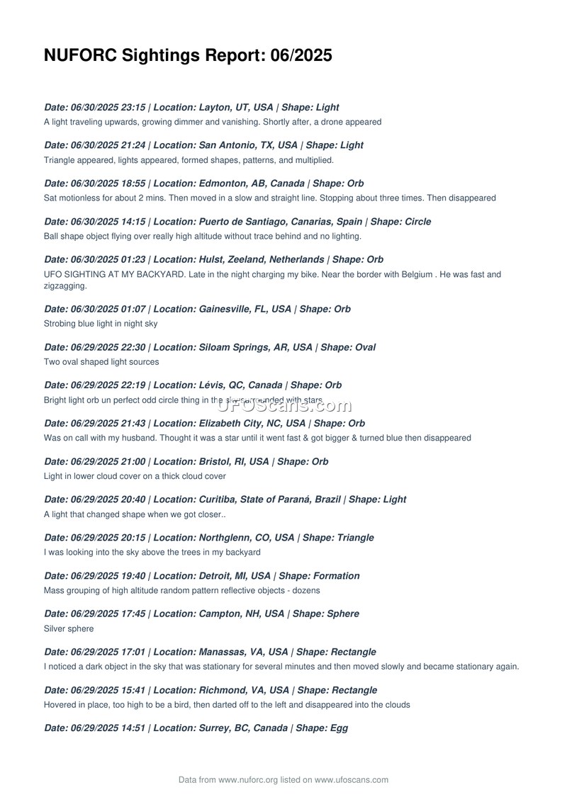 NUFORC Sightings Report: 06/2025
