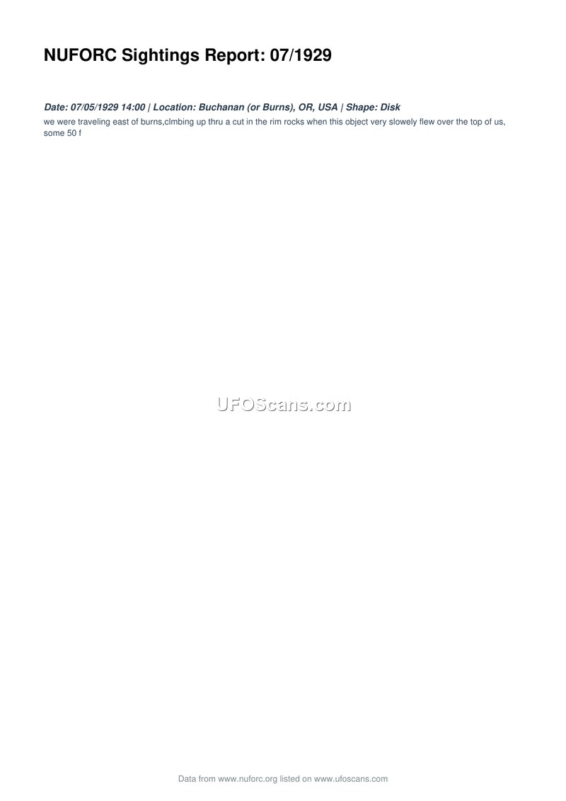 A report of a disk-shaped object observed flying slowly over witnesses near Burns, Oregon, on July 5, 1929. The document is an archived record from the National UFO Reporting Center.