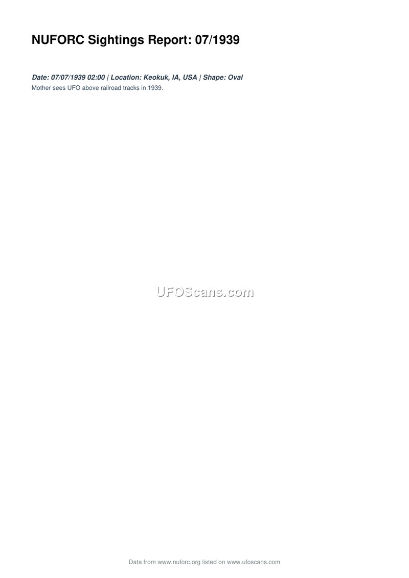 This document is a sighting report from the National UFO Reporting Center regarding an event that occurred on July 7, 1939, at 02:00 in Keokuk, Iowa. The report indicates that a witness, identified only as a mother, observed an oval-shaped unidentified aerial phenomenon positioned above railroad tracks.