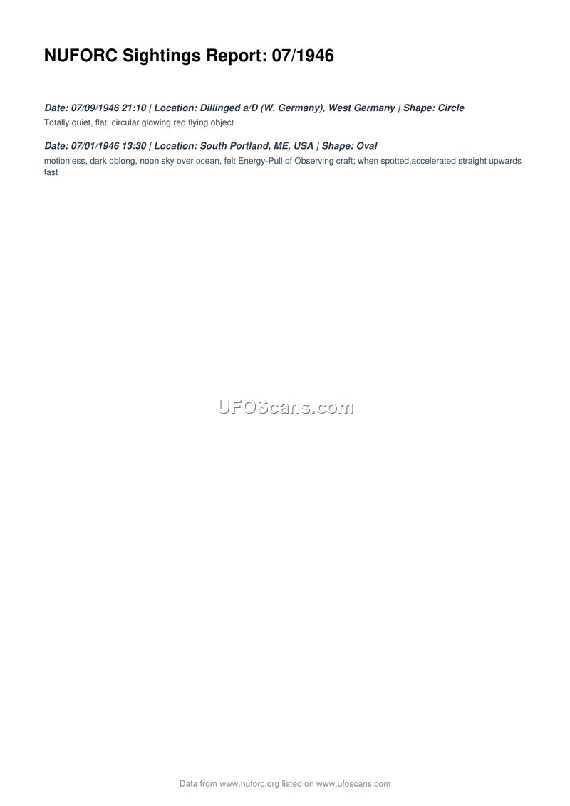 This document provides a summary of two UFO sightings recorded by the National UFO Reporting Center (NUFORC) occurring in July 1946. The first incident took place on July 9, 1946, at 21:10 in Dillinged a/D, West Germany. The witness described a totally quiet, flat, circular, glowing red flying object. The second incident occurred on July 1, 1946, at 13:30 in South Portland, Maine, USA. The witness observed a motionless, dark, oblong object in the noon sky over the ocean. The observer reported feeling an 'Energy-Pull' from the craft, which then accelerated straight upwards at a high speed when spotted.