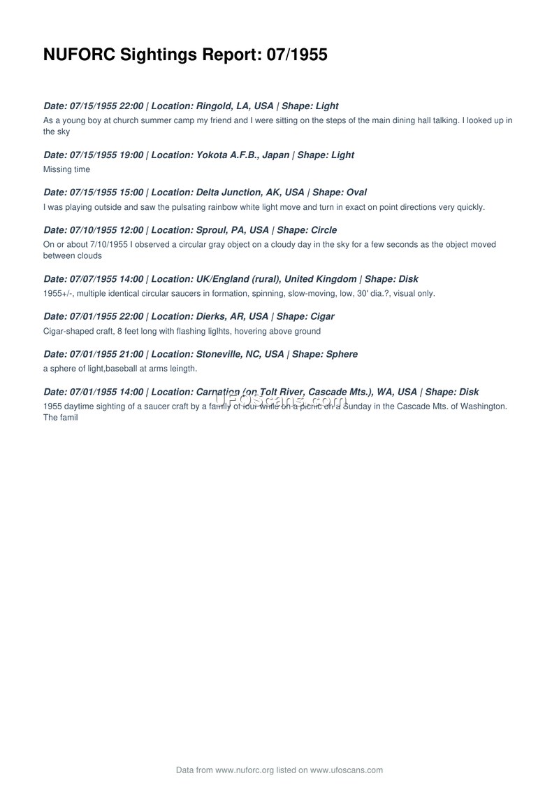 This document is a compilation of UFO sighting reports from July 1955, sourced from the National UFO Reporting Center (NUFORC). The report lists eight distinct incidents occurring throughout the month. The sightings include a variety of phenomena, such as lights, oval and circular objects, disks, cigars, and spheres. Locations of these sightings span across the United States, including Ringold, Louisiana; Delta Junction, Alaska; Sproul, Pennsylvania; Dierks, Arkansas; Stoneville, North Carolina; and Carnation, Washington. Additionally, one sighting is recorded at Yokota Air Force Base in Japan, and another in rural England. The descriptions provided by witnesses vary from simple observations of lights to more detailed accounts, such as a pulsating rainbow white light in Alaska, a circular gray object in Pennsylvania, and a cigar-shaped craft with flashing lights in Arkansas. One entry notes a 'missing time' event at Yokota A.F.B. Another report describes multiple identical circular saucers in formation in the United Kingdom. The document also mentions a daytime sighting by a family of four in the Cascade Mountains of Washington. The reports are brief, providing only the date, time, location, shape, and a short narrative description for each event.