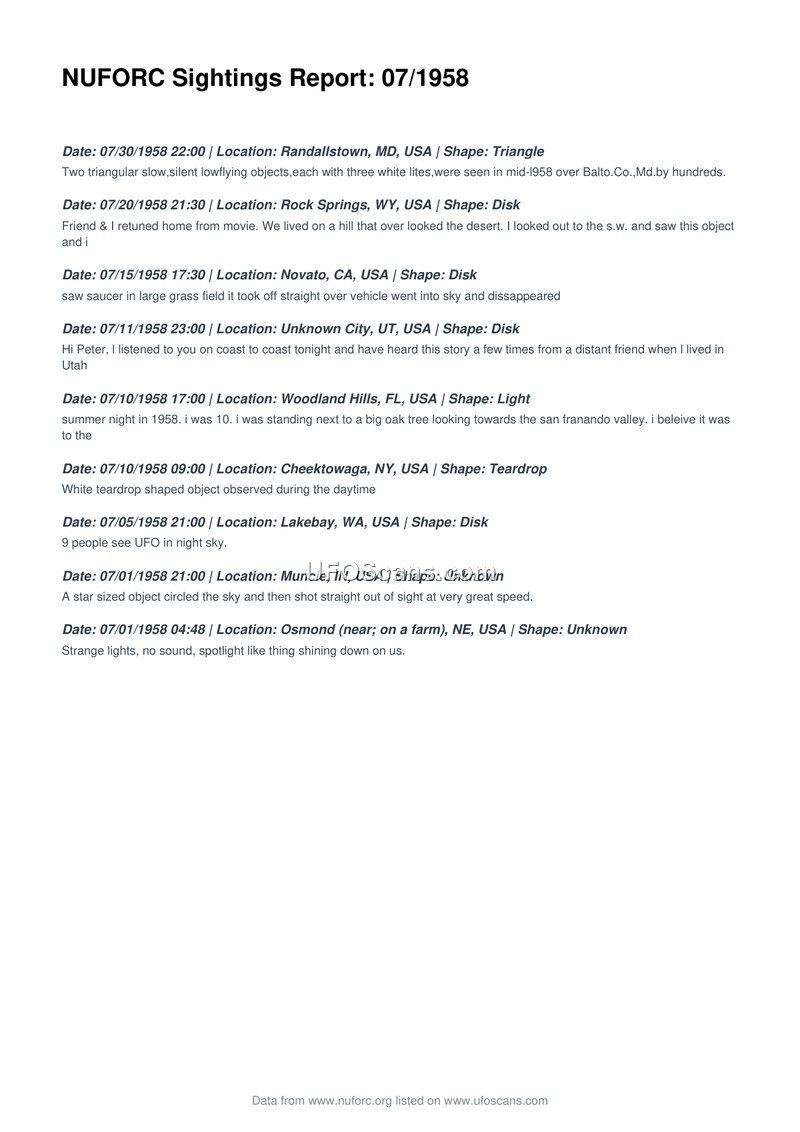 This document is a compilation of UFO sighting reports from July 1958, sourced from the National UFO Reporting Center (NUFORC). The report lists nine distinct incidents occurring across the United States, including locations in Maryland, Wyoming, California, Utah, Florida, New York, Washington, Indiana, and Nebraska. The sightings describe a variety of shapes, including triangles, disks, teardrops, and unidentified lights. Reported behaviors range from slow, silent flight to rapid movement and hovering. One report mentions a spotlight-like effect, while another describes a star-sized object moving at great speed. The document serves as a historical record of civilian-reported aerial phenomena during that month.