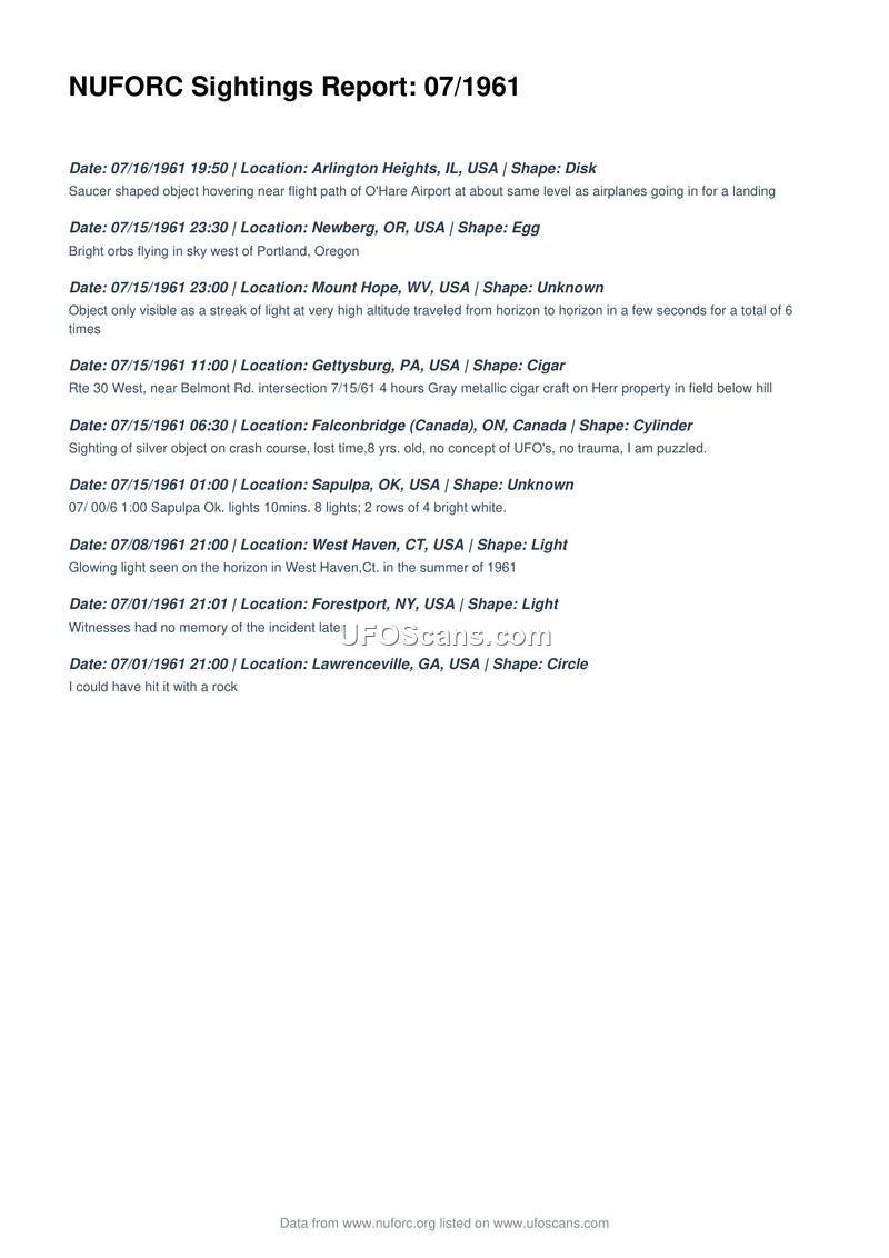 This document is a compilation of UFO sightings reported to the National UFO Reporting Center (NUFORC) for the month of July 1961. The report lists nine distinct incidents occurring between July 1 and July 16, 1961. The sightings span various locations across the United States, including Illinois, Oregon, West Virginia, Pennsylvania, Oklahoma, Connecticut, New York, and Georgia, as well as one report from Falconbridge, Ontario, Canada. The reported objects vary significantly in description, ranging from a disk-shaped object near O'Hare Airport to bright orbs, a streak of light, a gray metallic cigar-shaped craft, a silver cylinder, and various lights and circles. Some reports include specific details regarding the circumstances of the sighting, such as the object being on a crash course, the witness experiencing lost time, or the object being in close proximity to the observer. The document serves as a historical record of these reported phenomena as listed on the NUFORC and ufoscans websites.