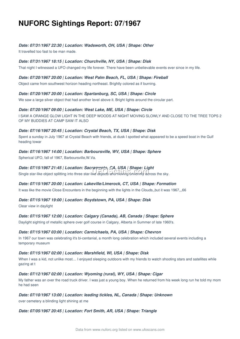 NUFORC Sightings Report: 07/1967