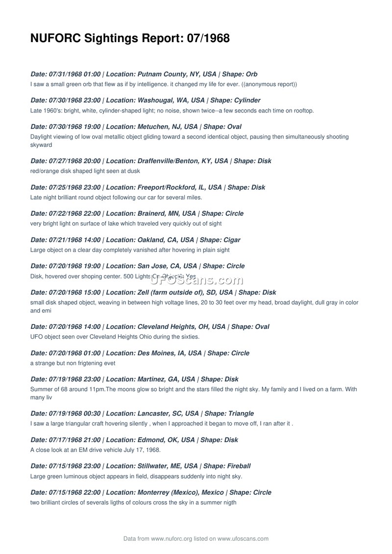This document is a compilation of UFO sighting reports from July 1968, sourced from the National UFO Reporting Center (NUFORC). The reports span a wide variety of locations across the United States, as well as international sightings in Mexico, Vietnam, Iran, and the Philippines. The sightings describe a diverse range of phenomena, including orbs, disks, cylinders, triangles, cigars, and various lights. Many reports emphasize the silent nature of the objects, their high-speed maneuvers, and their ability to hover or disappear suddenly. Several accounts mention specific interactions, such as objects following vehicles, hovering over power lines, or being chased by military aircraft. Notable entries include an air intercept between a UFO and a BOMARC missile test firing over the Gulf of Mexico, and reports of objects hovering over military installations like Quantico Marine Base and Otis Air Force Base. The document serves as a historical record of civilian and military-related observations during a period of high interest in unidentified aerial phenomena.
