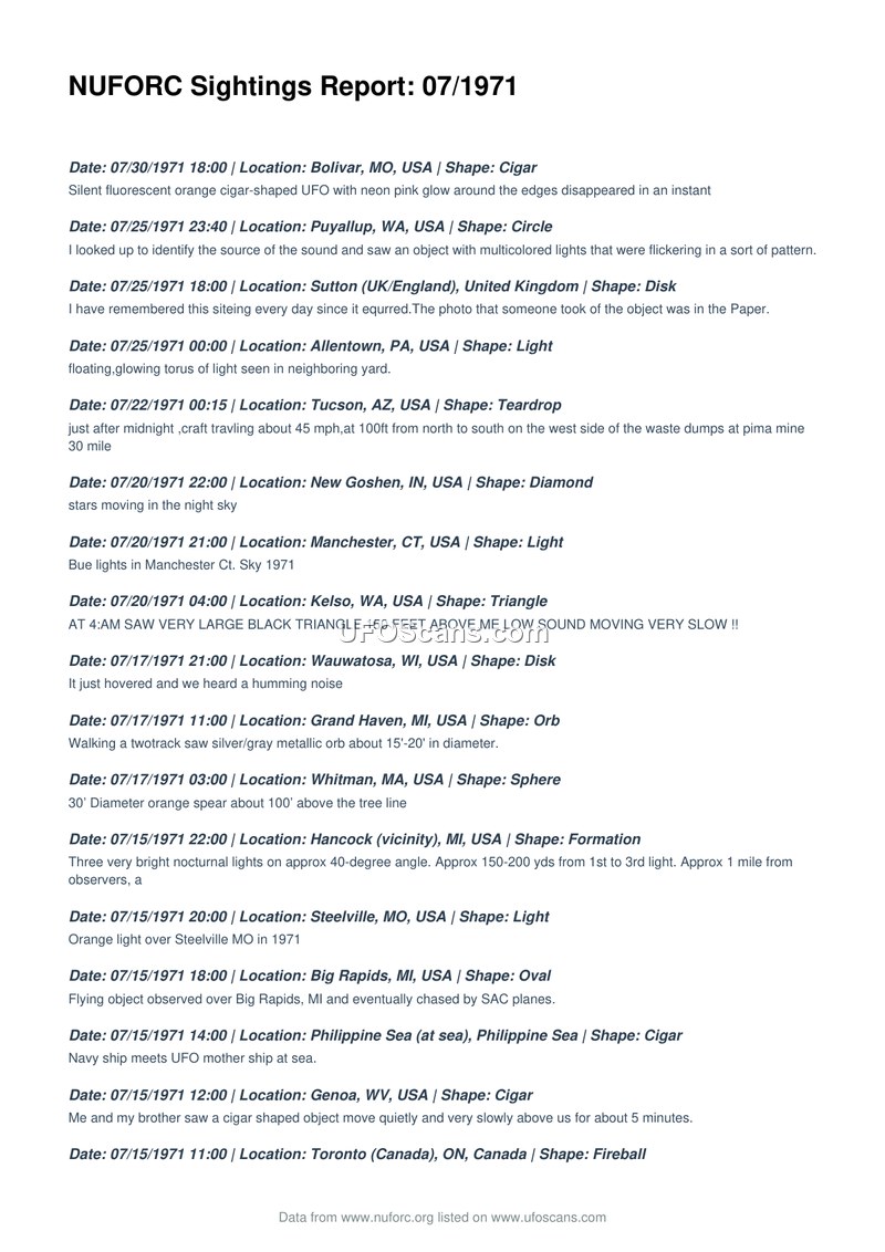 This document is a chronological list of UFO sightings reported to the National UFO Reporting Center during July 1971. It details various aerial phenomena observed globally, ranging from silent lights to high-speed craft.