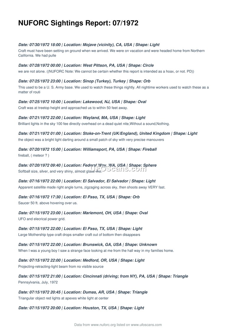 A collection of raw UFO sighting reports from July 1972 compiled by the National UFO Reporting Center. The document details various aerial phenomena observed globally, ranging from lights and fireballs to structured craft.