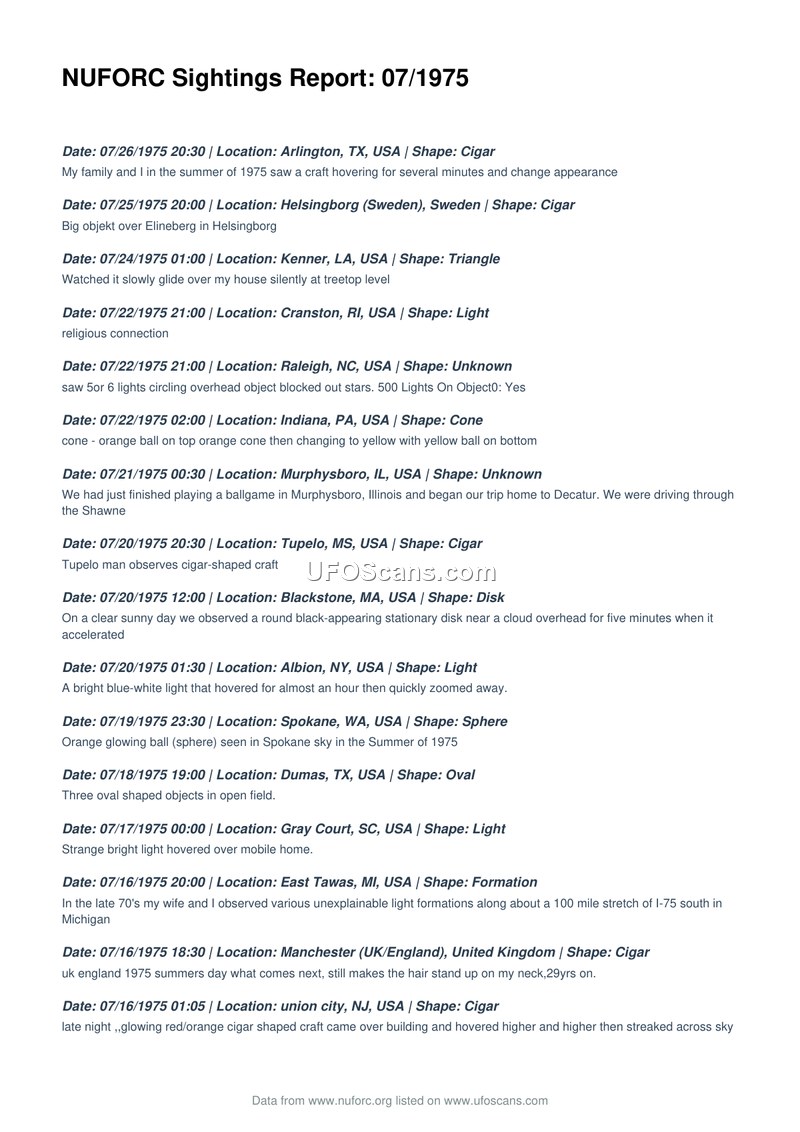 This document is a chronological list of UFO sightings reported to the National UFO Reporting Center during July 1975. It catalogs dozens of individual accounts from multiple countries, detailing various object shapes and behaviors.