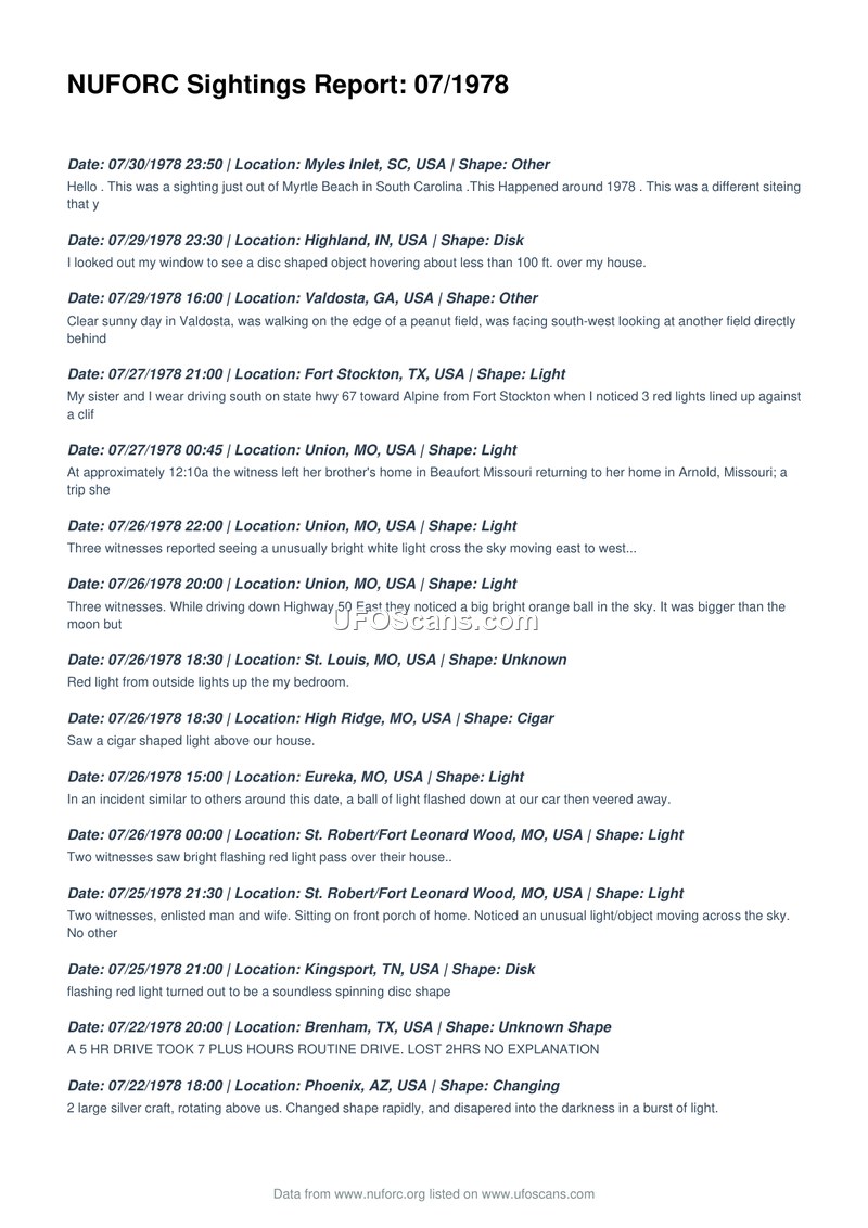 NUFORC Sightings Report: 07/1978
