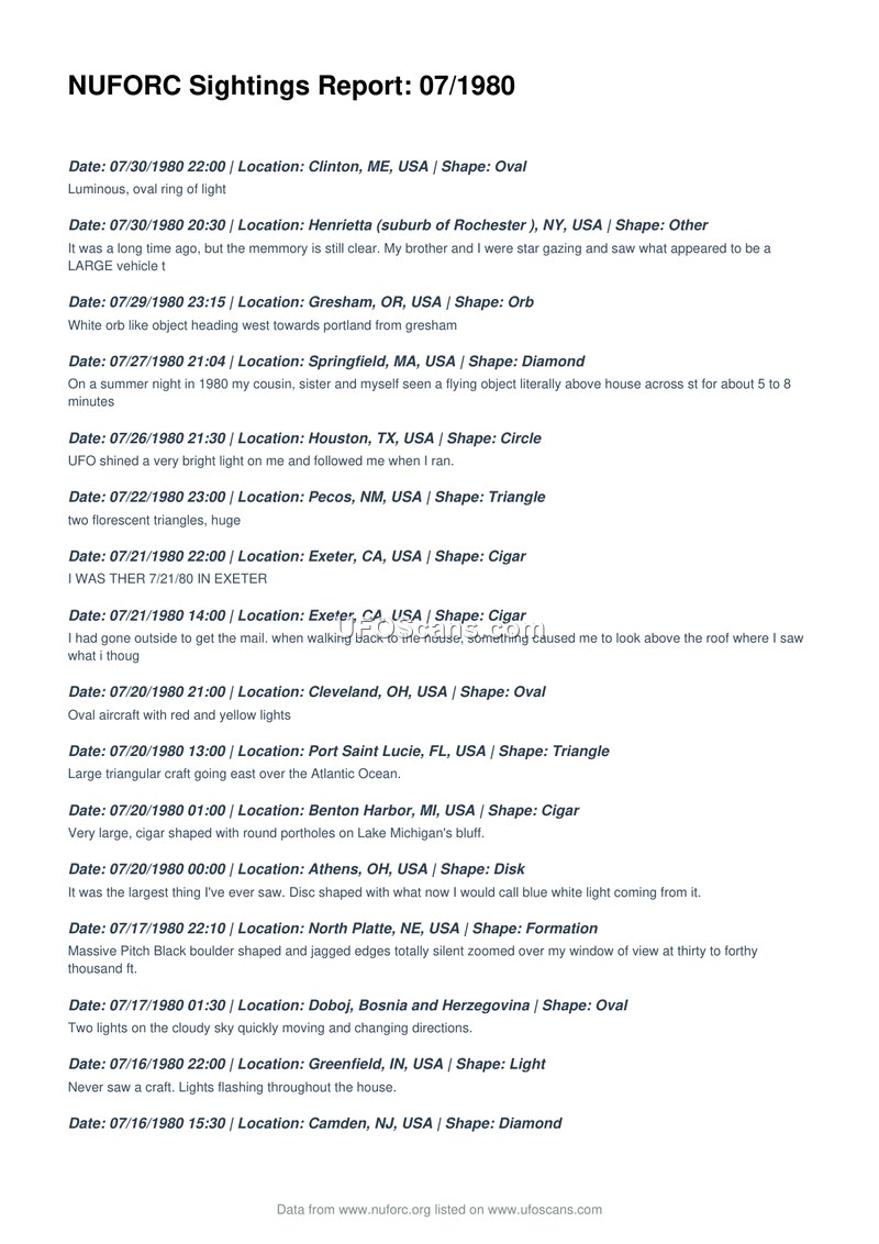 A chronological log of UFO sightings reported to the National UFO Reporting Center during July 1980. It documents diverse aerial phenomena observed globally by various witnesses.