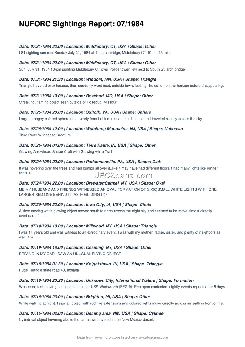 This document is a chronological list of UFO sightings reported to the National UFO Reporting Center in July 1984. It includes diverse accounts of aerial phenomena from North America and international waters.