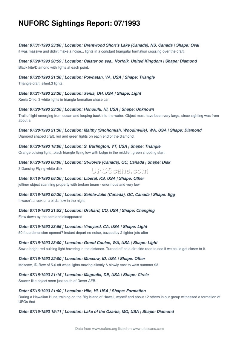 This document is a monthly log of UFO sightings reported to the National UFO Reporting Center in July 1993. It provides a chronological list of witness accounts from various international locations detailing diverse aerial phenomena.
