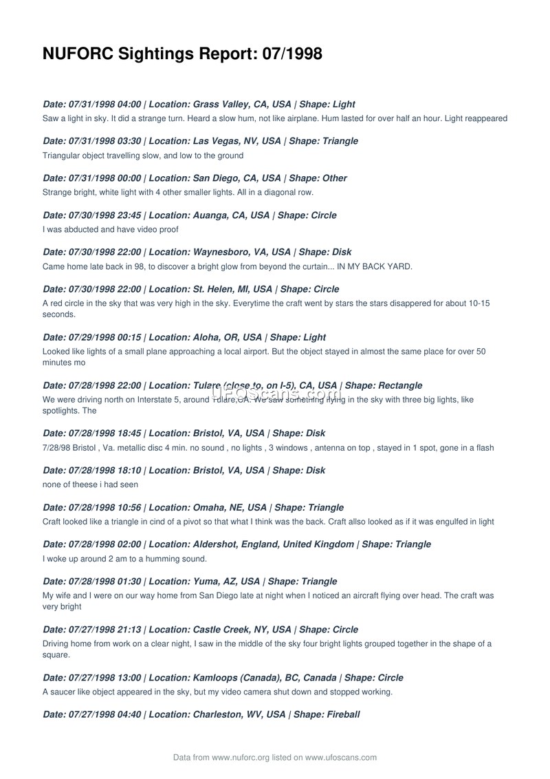 This document is a chronological log of UFO sightings reported to the National UFO Reporting Center during July 1998. It provides a global overview of witness accounts describing various shapes, behaviors, and environmental interactions associated with these phenomena.