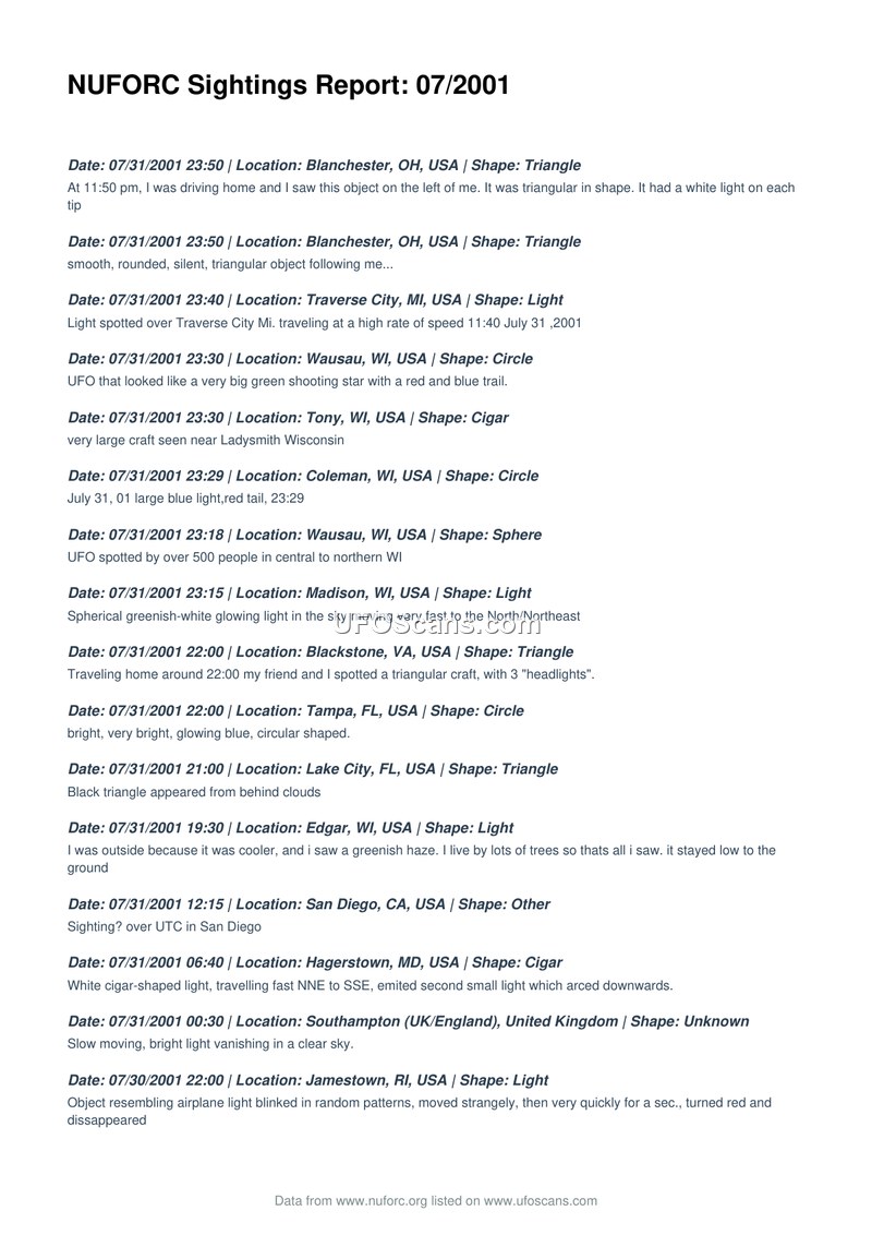 This document is a comprehensive compilation of Unidentified Aerial Phenomena (UAP) sighting reports collected by the National UFO Reporting Center (NUFORC) for the month of July 2001. The report lists hundreds of individual accounts submitted by witnesses from across the United States, Canada, the United Kingdom, Australia, and several other nations. The entries are organized chronologically, beginning with reports from July 31, 2001, and extending back through the month to July 1, 2001. Each entry provides the date, time, location, and a brief description of the observed object or phenomenon. The shapes reported are highly varied, including triangles, circles, spheres, cigars, disks, ovals, fireballs, and various light formations. Witness descriptions frequently emphasize unusual flight characteristics, such as extreme speed, erratic movement, hovering, silent operation, and sudden disappearances. Many reports mention multiple witnesses, and some accounts describe interactions with or proximity to conventional aircraft, such as jets or helicopters. Several entries note specific environmental conditions, such as clear skies or storm clouds, and some witnesses describe physical or auditory phenomena, including sonic booms, humming noises, or the release of smaller objects. The document serves as a raw data repository for public sightings, reflecting the diverse and often subjective nature of UAP reporting during this period. While some reports are brief, others provide more detailed context, such as the sighting of a large triangular craft by over 500 people in Wisconsin or the mass sighting of lights over the New Jersey Turnpike on July 15, 2001. The document also includes occasional notes from NUFORC regarding the status of certain reports, such as unconfirmed abduction claims or follow-up information from other organizations like the Missouri Investigators Group or Canadian reporting bodies.