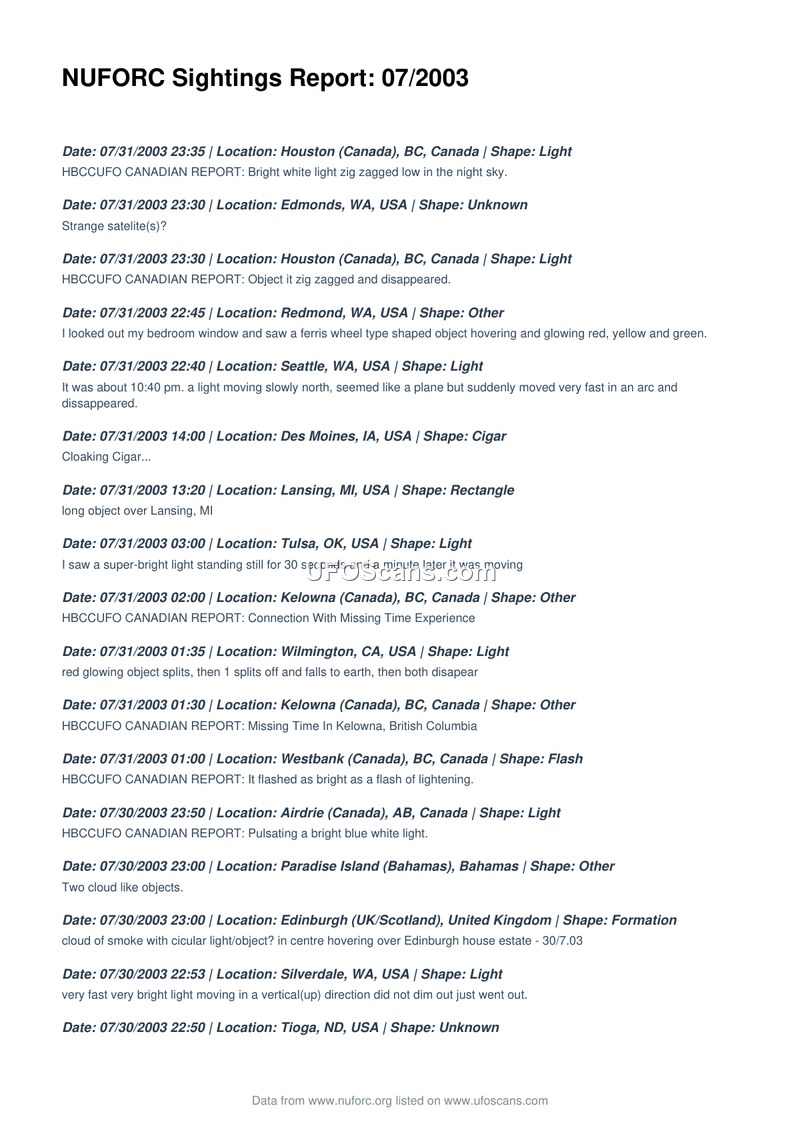 This document is a chronological compilation of hundreds of public UFO sighting reports submitted to the National UFO Reporting Center (NUFORC) during July 2003. It provides a global record of diverse aerial phenomena, ranging from simple light observations to complex structured craft sightings.