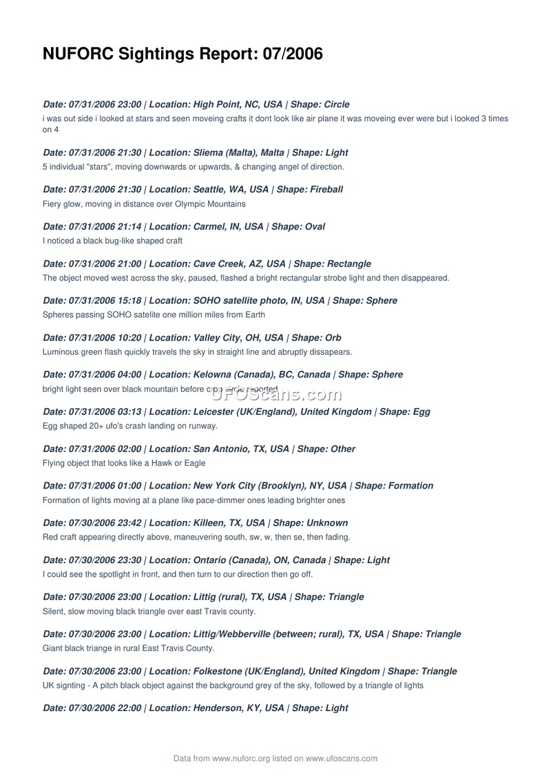 This document is a comprehensive compilation of UFO and UAP sighting reports submitted to the National UFO Reporting Center (NUFORC) for the month of July 2006. The report spans 26 pages and details hundreds of individual accounts from witnesses across the globe, including the United States, Canada, the United Kingdom, Australia, India, and various other nations. The sightings are presented in chronological order, beginning on July 31, 2006, and extending back through the month to July 1, 2006. Each entry provides the date, time, location, and the reported shape of the object. The descriptions of the phenomena are highly varied, ranging from simple lights and fireballs to complex geometric shapes such as triangles, disks, cigars, and spheres. Many witnesses describe erratic flight patterns, high speeds, sudden disappearances, and hovering capabilities that defy conventional aircraft performance. Several reports mention specific environmental or situational contexts, such as sightings near military installations like Beal Air Force Base and Eglin Air Force Base, or observations made during specific events like the space shuttle launch. Some entries include brief anecdotal details from the witnesses, such as feelings of anxiety, the observation of multiple objects in formation, or the presence of unusual sounds or lack thereof. The document also contains occasional editorial notes from NUFORC, which offer potential explanations for certain sightings, such as the possibility of Iridium satellites, celestial bodies like Jupiter, or advertising lights, while also flagging some reports as potential hoaxes or lacking sufficient information. The compilation serves as a raw data repository for public reports of aerial anomalies, reflecting the diverse and often subjective nature of witness testimony regarding unidentified aerial phenomena during this period.