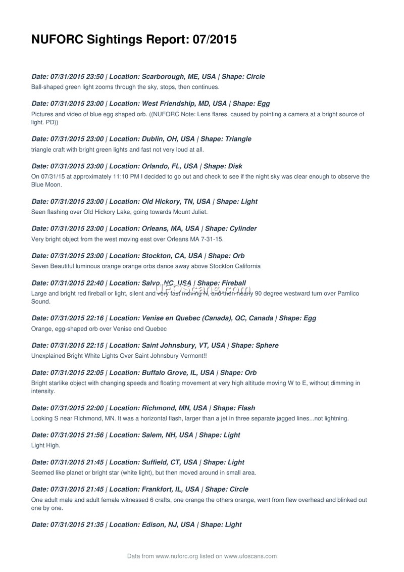 This document is a monthly compilation of hundreds of UAP sighting reports submitted to the National UFO Reporting Center in July 2015. It provides a chronological record of witness accounts, including descriptions of object shapes, behaviors, and locations, with occasional editorial notes from NUFORC staff.