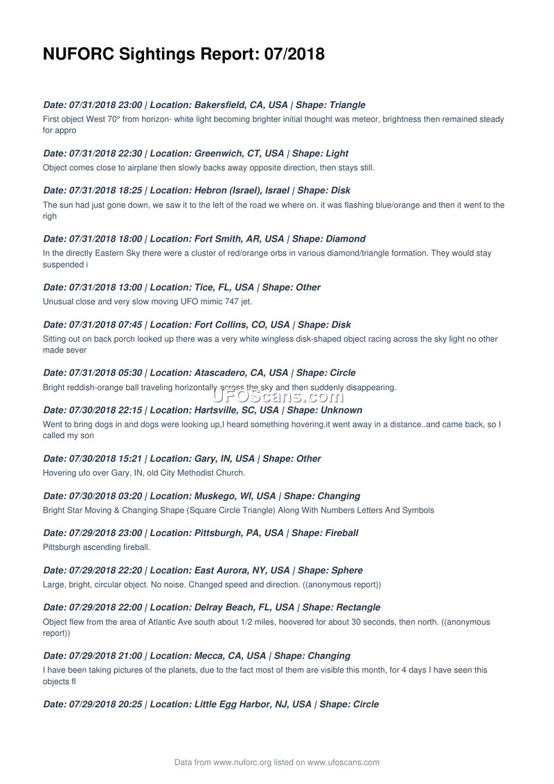 This document is a monthly compilation of hundreds of UFO/UAP sighting reports submitted to the National UFO Reporting Center in July 2018. It provides a global snapshot of witness accounts, documenting diverse object shapes, behaviors, and locations.