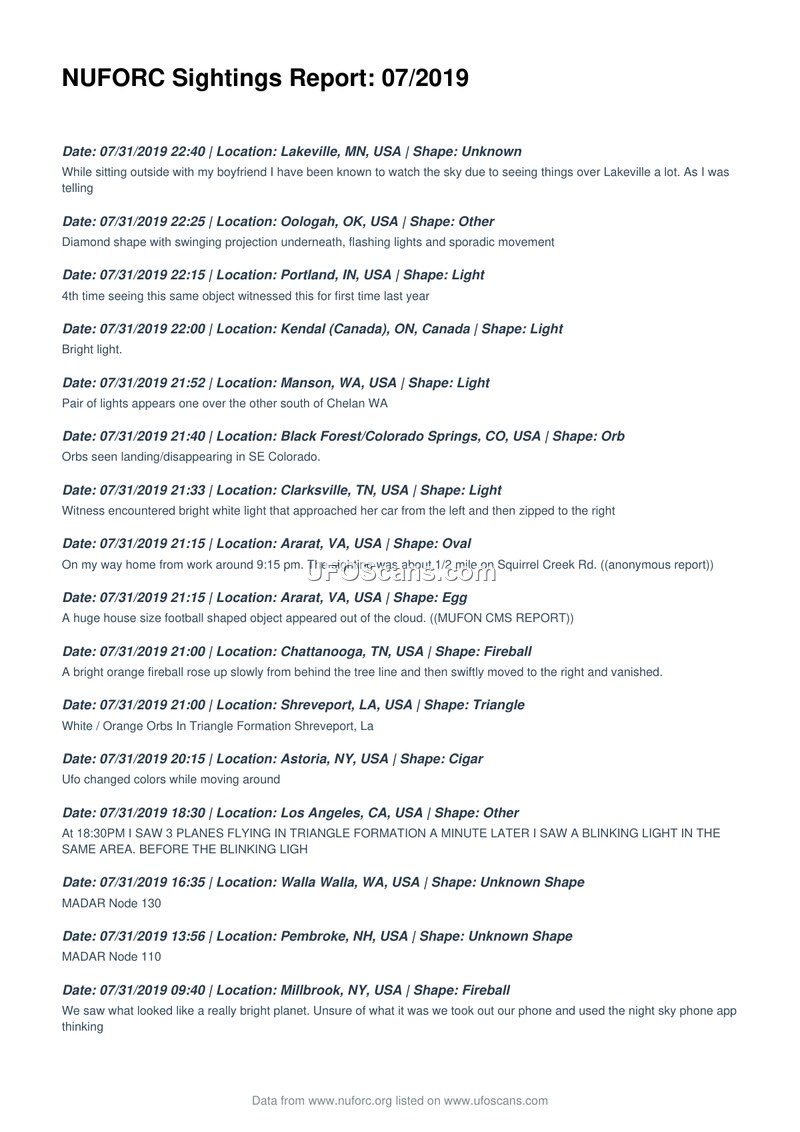 This document is a chronological compilation of hundreds of civilian UFO/UAP sighting reports submitted to the National UFO Reporting Center during July 2019. It documents diverse aerial phenomena observed globally, ranging from simple lights to complex geometric craft.