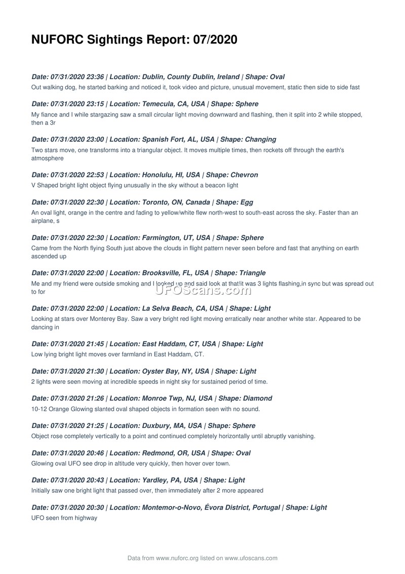 This document is a monthly compilation of hundreds of public UFO/UAP sighting reports submitted to the National UFO Reporting Center (NUFORC) during July 2020. It provides a chronological record of witness accounts, object descriptions, and locations, serving as a primary data source for UAP research.