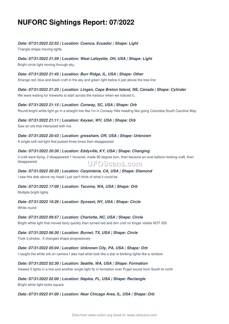 This document is a comprehensive compilation of Unidentified Aerial Phenomena (UAP) sighting reports submitted to the National UFO Reporting Center (NUFORC) for the month of July 2022. The report consists of hundreds of individual entries, each detailing specific sightings reported by members of the public across the United States, Canada, the United Kingdom, Australia, and other international locations. The entries are organized chronologically, beginning with reports from July 31, 2022, and extending back through the month. Each entry typically includes the date, time, location, and a brief description of the object's shape and the witness's experience. The reported shapes are highly diverse, including orbs, discs, cigars, triangles, cylinders, and various lights. Witness descriptions frequently highlight anomalous behaviors, such as instantaneous acceleration, hovering, erratic movement, and silent flight. Several reports mention the use of technology to document these events, including cell phone cameras, infrared cameras, and spotting scopes. A recurring theme in several reports is the mention of MADAR (Multiple Anomaly Detection and Assessment Response) sites, with witnesses noting magnetometer spikes and compass variations coinciding with their sightings. Some witnesses describe more intense encounters, including reports of paralysis, contact with a ship, and interactions with entities. The document serves as a raw data repository, reflecting the subjective experiences of witnesses rather than providing official government or military analysis. The reports vary significantly in detail, ranging from simple observations of lights to complex accounts of structured craft and technological interference.