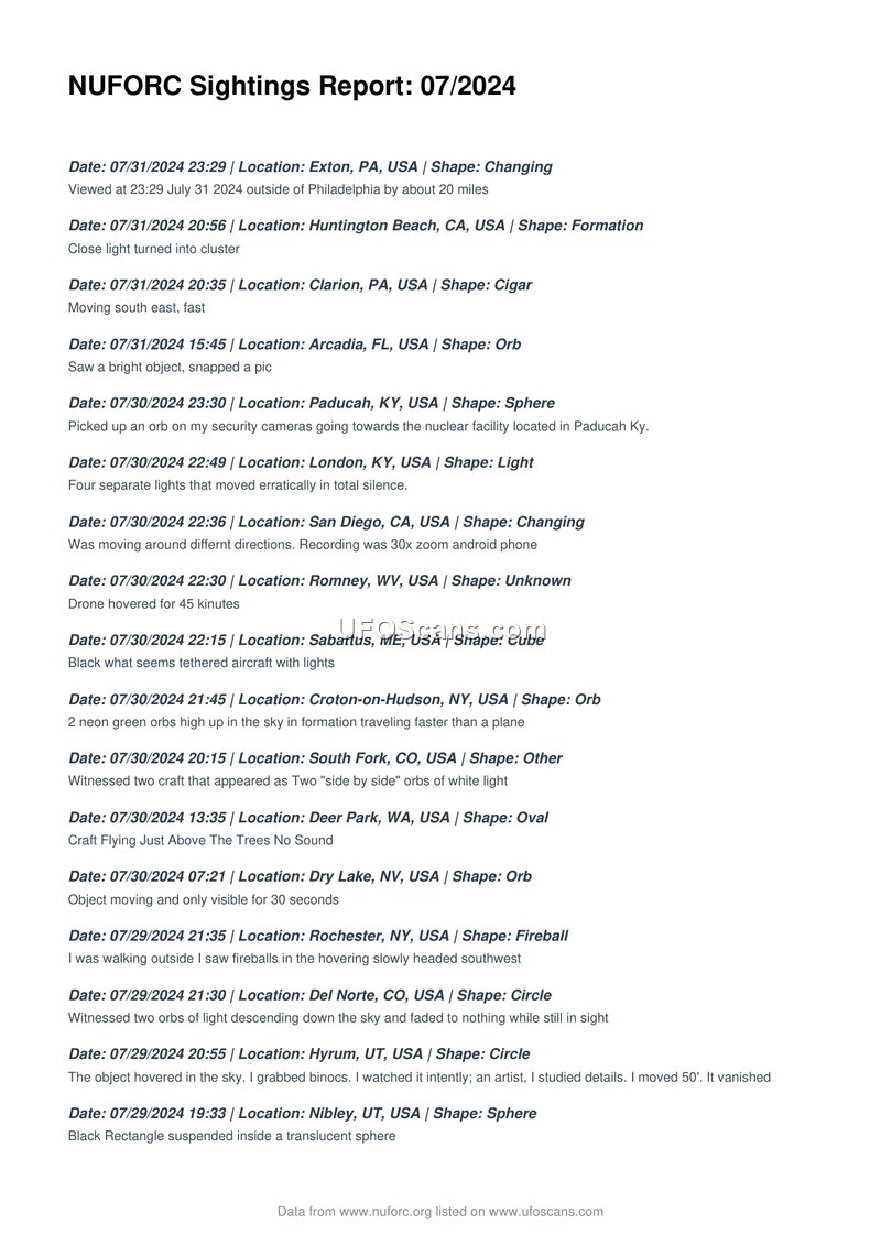 NUFORC Sightings Report: 07/2024