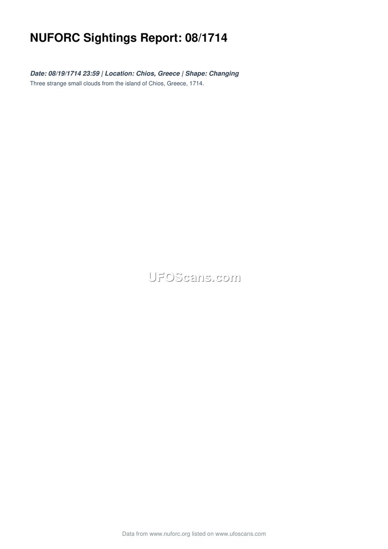 A historical sighting report from the National UFO Reporting Center detailing the observation of three changing, small clouds over Chios, Greece, on August 19, 1714.
