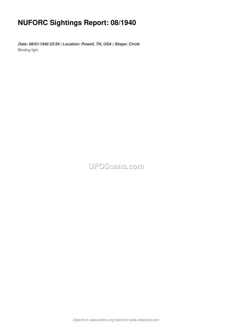A report of a circular, blinding light observed in Powell, Tennessee, on August 1, 1940. The data is sourced from the National UFO Reporting Center.