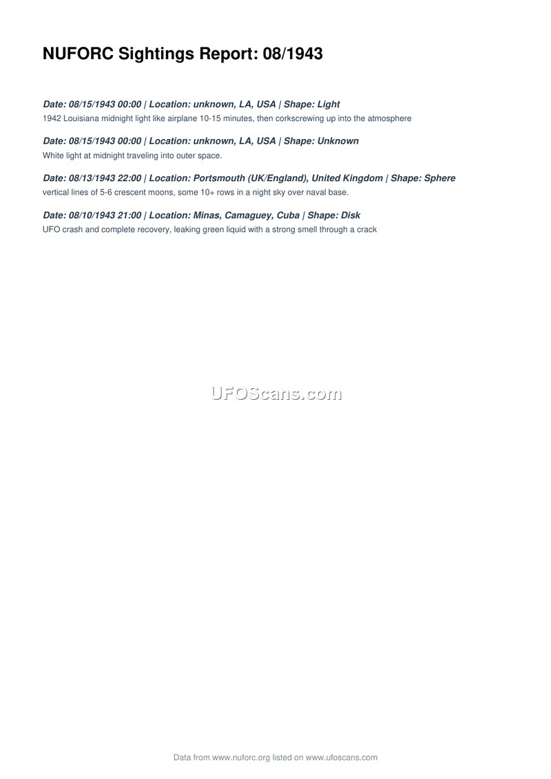 This document, titled 'NUFORC Sightings Report: 08/1943', provides a brief compilation of four distinct aerial phenomena reports occurring in August 1943. The first two entries describe sightings in Louisiana, USA, on August 15, 1943. One report details a light resembling an airplane that performed a corkscrewing maneuver into the atmosphere for 10-15 minutes, while the second describes a white light traveling into outer space at midnight. On August 13, 1943, a sighting in Portsmouth, United Kingdom, involved a sphere-shaped object described as having vertical lines of 5-6 crescent moons, appearing in 10 or more rows over a naval base. Finally, on August 10, 1943, a report from Minas, Camaguey, Cuba, documents a disk-shaped object that crashed and was recovered, noting that it leaked a green liquid with a strong smell through a crack.