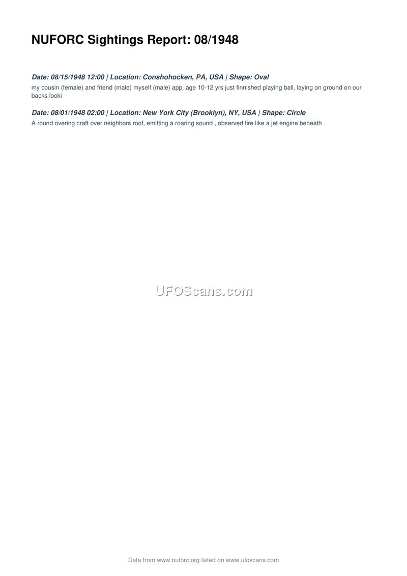This document provides a summary of two separate UFO sighting reports from August 1948, as compiled by the National UFO Reporting Center. The first incident occurred on August 15, 1948, in Conshohocken, Pennsylvania. The witness, a male, reported that he, his female cousin, and a male friend—all approximately 10 to 12 years of age—observed an oval-shaped object while lying on the ground after playing ball. The second incident took place on August 1, 1948, in Brooklyn, New York City. In this instance, the witness observed a circular craft hovering over a neighbor's roof. The object was described as emitting a roaring sound and displaying fire beneath it, similar to a jet engine.
