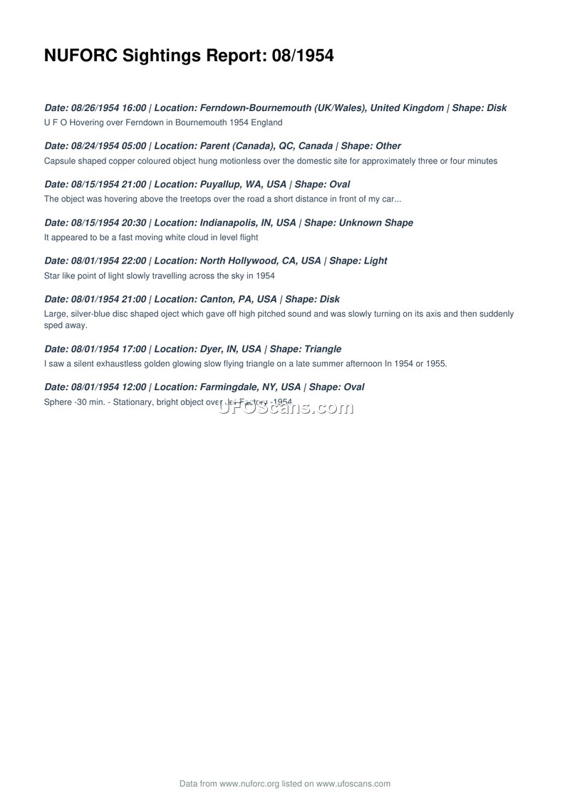 This document is a compilation of UFO sightings reported to the National UFO Reporting Center (NUFORC) for the month of August 1954. The report lists eight distinct incidents occurring across the United Kingdom, Canada, and the United States. The sightings describe a variety of phenomena, including a disk-shaped object hovering over Ferndown, England, on August 26, and a capsule-shaped, copper-colored object observed in Parent, Quebec, on August 24. Other reports include an oval object in Puyallup, Washington, and a fast-moving white cloud in Indianapolis, Indiana, both on August 15. The month also saw reports of a star-like point of light in North Hollywood, California, a silver-blue disk in Canton, Pennsylvania, a golden glowing triangle in Dyer, Indiana, and a stationary sphere over a jet factory in Farmingdale, New York, all occurring on August 1. The descriptions provided by witnesses vary from silent, slow-moving objects to those emitting high-pitched sounds, with durations ranging from brief observations to approximately thirty minutes.