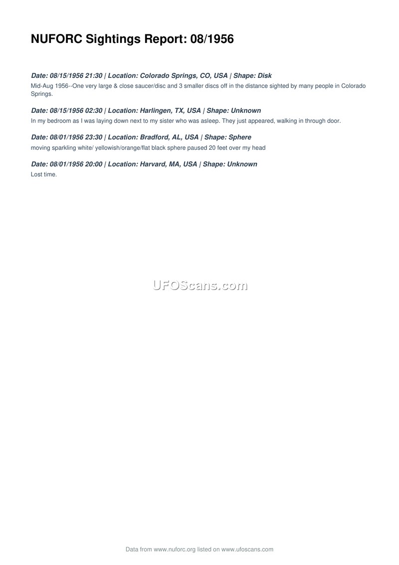 This document, titled 'NUFORC Sightings Report: 08/1956', provides a brief summary of four distinct unidentified aerial phenomena reports occurring in August 1956. The first incident, dated August 15, 1956, at 21:30 in Colorado Springs, Colorado, involved the sighting of one very large, close saucer or disc accompanied by three smaller discs, observed by multiple people. The second incident occurred on August 15, 1956, at 02:30 in Harlingen, Texas, where an individual reported that entities appeared in their bedroom while they were lying next to their sleeping sister. The third report, from August 1, 1956, at 23:30 in Bradford, Alabama, describes a sparkling white, yellowish, orange, and flat black sphere that hovered 20 feet above the witness. The final report, also from August 1, 1956, at 20:00 in Harvard, Massachusetts, consists of a single entry noting 'Lost time.' The document serves as a compilation of these accounts as recorded by the National UFO Reporting Center.