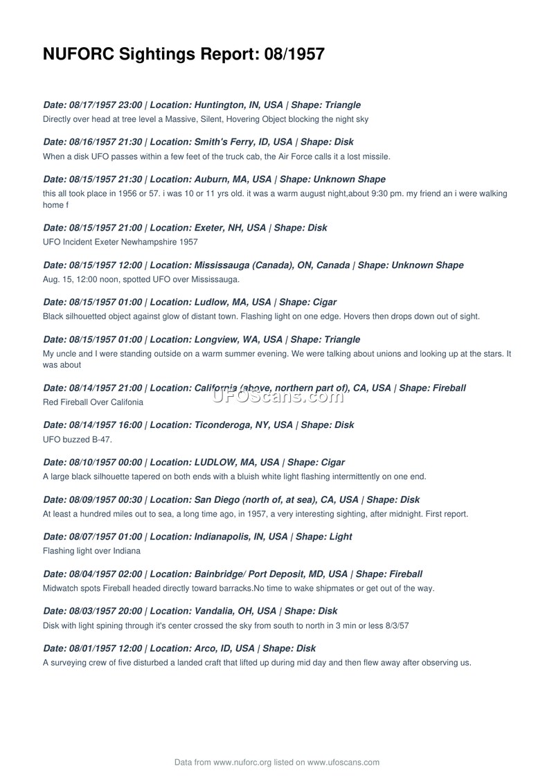 This document is a compilation of UFO sighting reports from August 1957, sourced from the National UFO Reporting Center (NUFORC). The report lists fifteen distinct incidents occurring between August 1 and August 17, 1957. Locations span across the United States, including Indiana, Idaho, Massachusetts, New Hampshire, Washington, California, New York, and Maryland, as well as one report from Mississauga, Canada. The reported objects vary in shape, including triangles, disks, cigars, fireballs, and lights. Witness accounts describe various behaviors, such as hovering, buzzing a B-47 aircraft, and moving across the sky. One report from Smith's Ferry, Idaho, notes that the Air Force characterized a disk-shaped object as a 'lost missile.' Another report from Bainbridge/Port Deposit, Maryland, describes a fireball moving toward military barracks. The document serves as a historical record of public-reported aerial phenomena during this period.