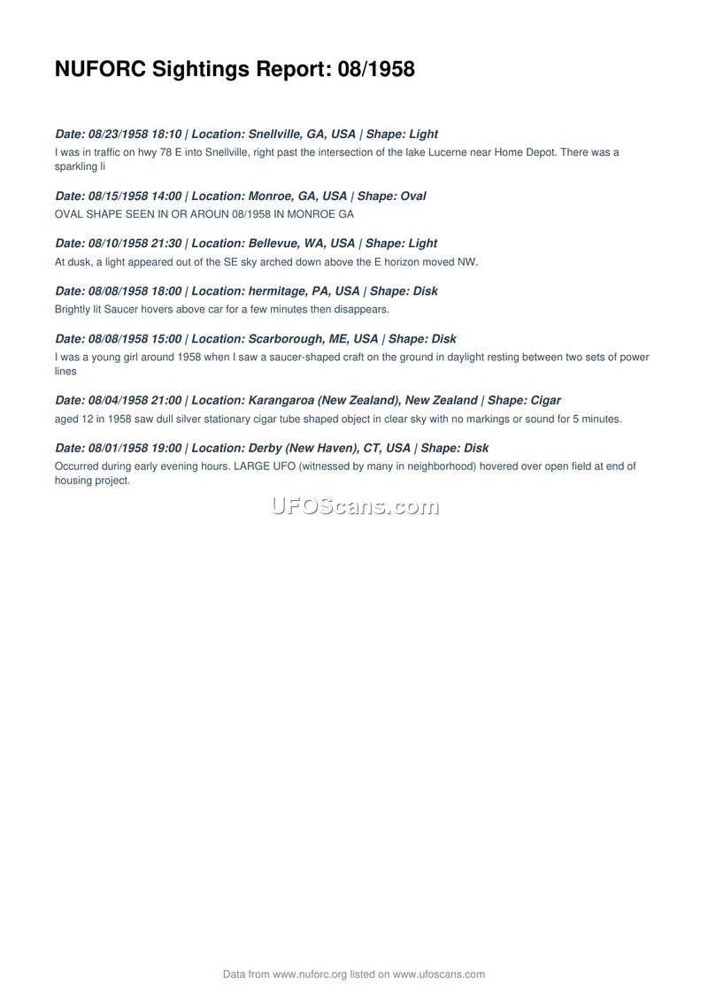 This document is a compilation of seven UFO sighting reports recorded by the National UFO Reporting Center (NUFORC) for the month of August 1958. The sightings occurred across various locations in the United States, including Georgia, Washington, Pennsylvania, Maine, and Connecticut, as well as one report from Karangaroa, New Zealand. The reported objects varied in shape, including lights, ovals, disks, and a cigar-shaped object. Descriptions of the events range from a light moving across the sky in Bellevue, Washington, to a saucer-shaped craft resting on the ground between power lines in Scarborough, Maine, and a large object hovering over an open field in Derby, Connecticut. The reports include anecdotal details from witnesses, such as a young girl observing a craft in 1958 and a witness in New Zealand who observed a stationary cigar-shaped object for five minutes in a clear sky.