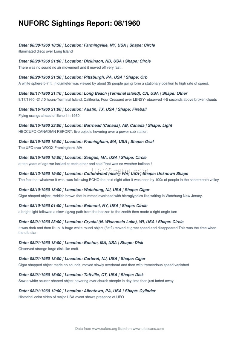 NUFORC Sightings Report: 08/1960