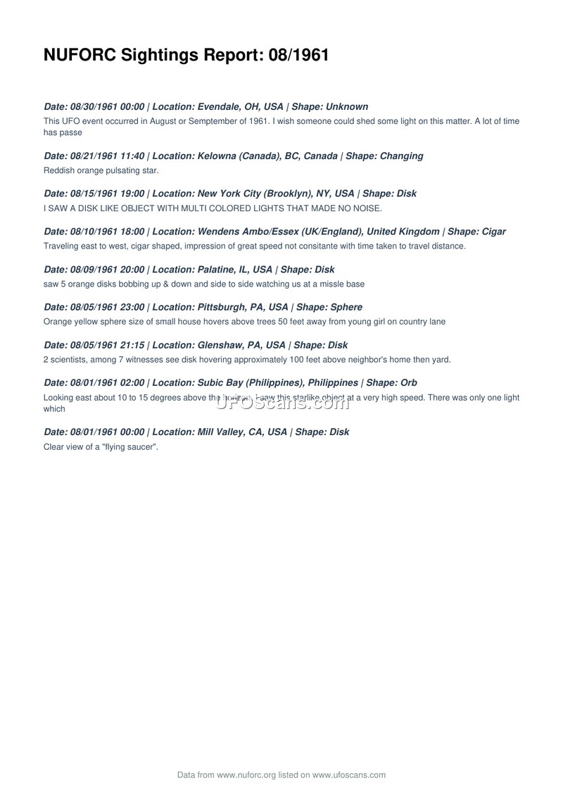 This document is a compilation of UFO sightings reported to the National UFO Reporting Center (NUFORC) for the month of August 1961. The report lists nine distinct incidents occurring across various locations, including the United States, Canada, the United Kingdom, and the Philippines. The sightings describe a variety of aerial phenomena, including disks, spheres, orbs, and cigar-shaped objects. Specific details provided by witnesses include observations of multi-colored lights, silent flight, high-speed travel, and hovering behavior. One report from Palatine, Illinois, mentions five orange disks observed near a missile base. Another report from Glenshaw, Pennsylvania, notes that two scientists were among seven witnesses who observed a disk hovering over a residence. The document serves as a historical record of public reports submitted to the organization regarding unidentified aerial phenomena during this period.
