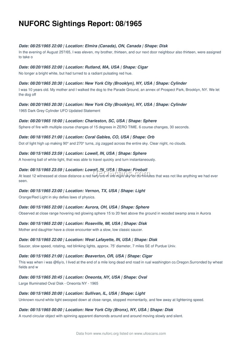 A collection of UFO sighting reports from August 1965, documenting various aerial phenomena observed across North America and the UK. The reports include descriptions of diverse object shapes and behaviors, including military encounters.