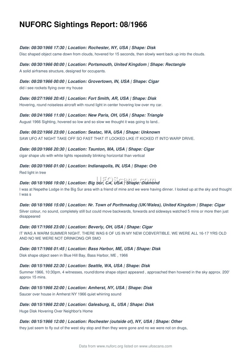 This document is a chronological list of 25 UFO sightings reported to the National UFO Reporting Center during August 1966. It provides brief descriptions of the objects, locations, and dates for each incident.