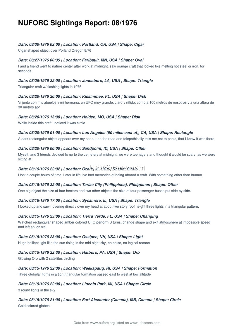 This document is a compilation of Unidentified Aerial Phenomena (UAP) sightings reported to the National UFO Reporting Center (NUFORC) during the month of August 1976. The report lists numerous individual accounts spanning various locations across the United States, Canada, the Philippines, and France. The sightings describe a wide variety of objects, including cigars, triangles, disks, orbs, cylinders, and lights, with varying behaviors ranging from hovering and slow movement to high-velocity flight and sudden disappearance. Several reports include anecdotal details such as telepathic communication, missing time, abduction claims, and physical interactions with the environment, such as the emission of smaller objects or the creation of ion trails. The document serves as a chronological log of these civilian reports, providing dates, times, locations, and brief descriptions of the phenomena observed by witnesses.