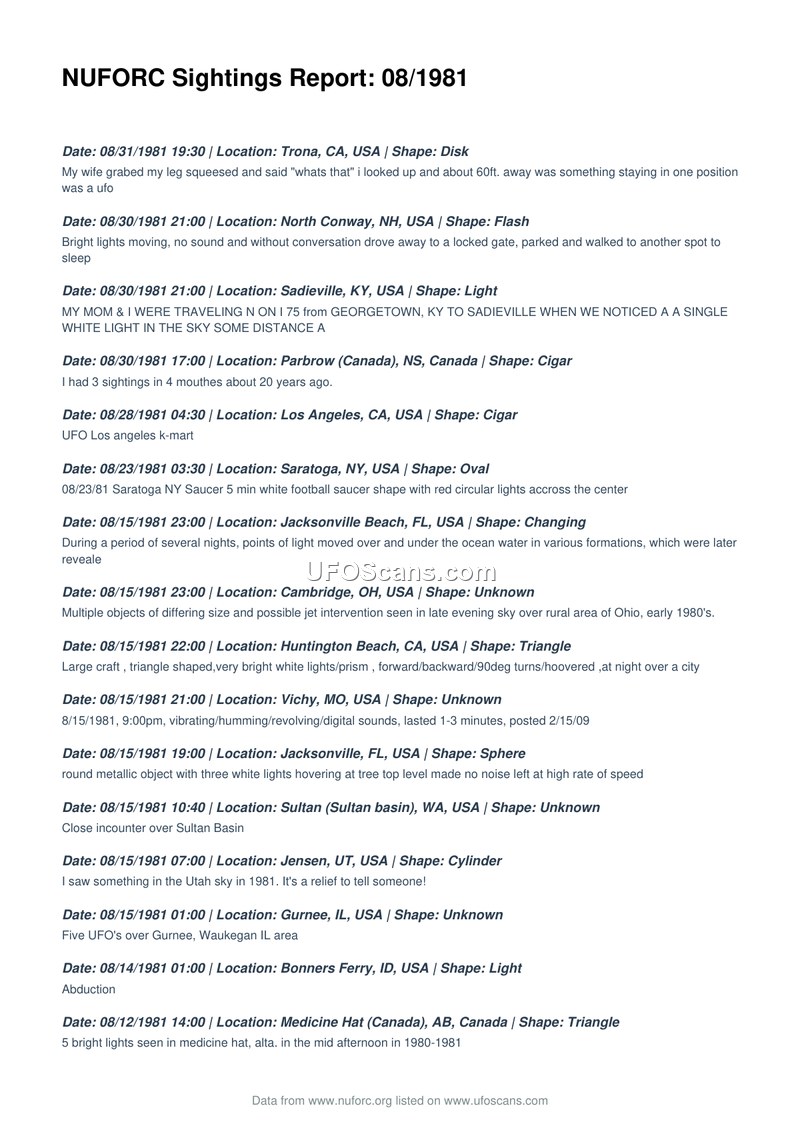 This document is a compilation of UFO sightings reported to the National UFO Reporting Center (NUFORC) for the month of August 1981. The report lists 26 distinct entries, detailing sightings across the United States, Canada, and South Korea. The reports describe a wide variety of phenomena, including objects identified as disks, cigars, triangles, spheres, cylinders, cones, and rectangles, as well as instances of lights and unidentified shapes. Witness accounts vary significantly in nature, ranging from simple observations of lights in the sky to more complex reports involving maneuvers, hovering, and high-speed flight. Several entries mention specific behaviors, such as objects changing shape, emitting sounds like humming or vibrating, or displaying bright lights. Notably, the report includes several accounts of alleged abductions, with witnesses describing memories surfacing later in life or during dreams. Other reports mention interactions or proximity to conventional aircraft, such as a formation involving two Air Force jets, or the transformation of an object into a 707 airliner. The geographic distribution of these sightings is broad, covering locations from Trona, California, to Medicine Hat, Alberta, and even the Republic of South Korea. The document serves as a raw data log, providing dates, times, locations, and brief descriptions of the reported events as submitted to the center.