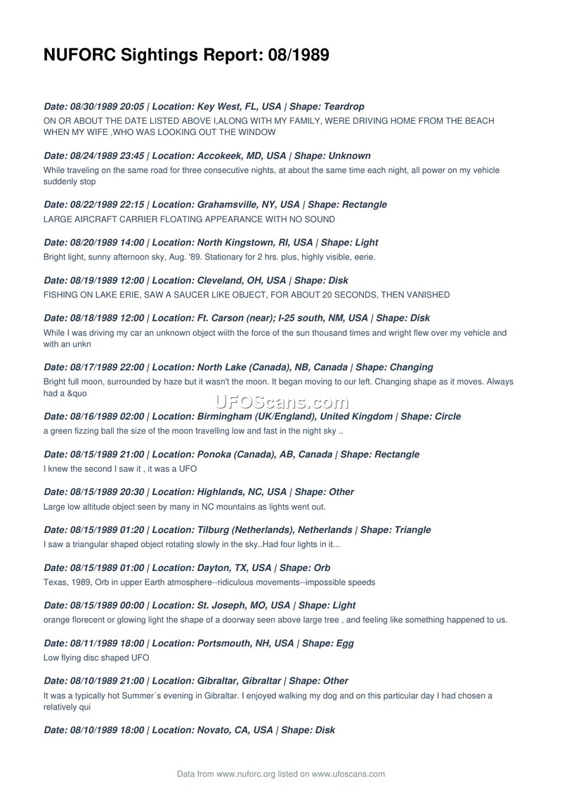 This document is a chronological list of UFO sightings reported to the National UFO Reporting Center during August 1989. It details various aerial phenomena observed globally, ranging from silent, low-altitude objects to high-speed, maneuvering lights.