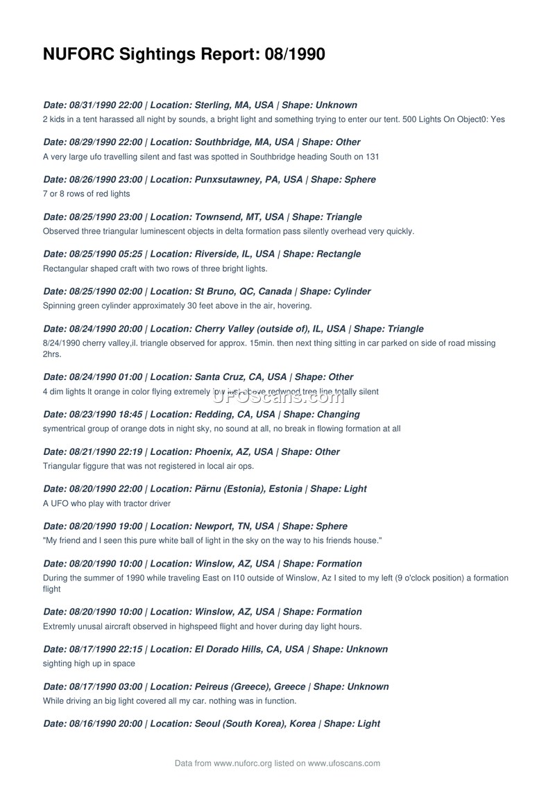This document is a chronological list of UFO sightings reported to the National UFO Reporting Center in August 1990. It catalogs diverse aerial phenomena observed globally, ranging from simple light sightings to complex reports of craft and missing time.