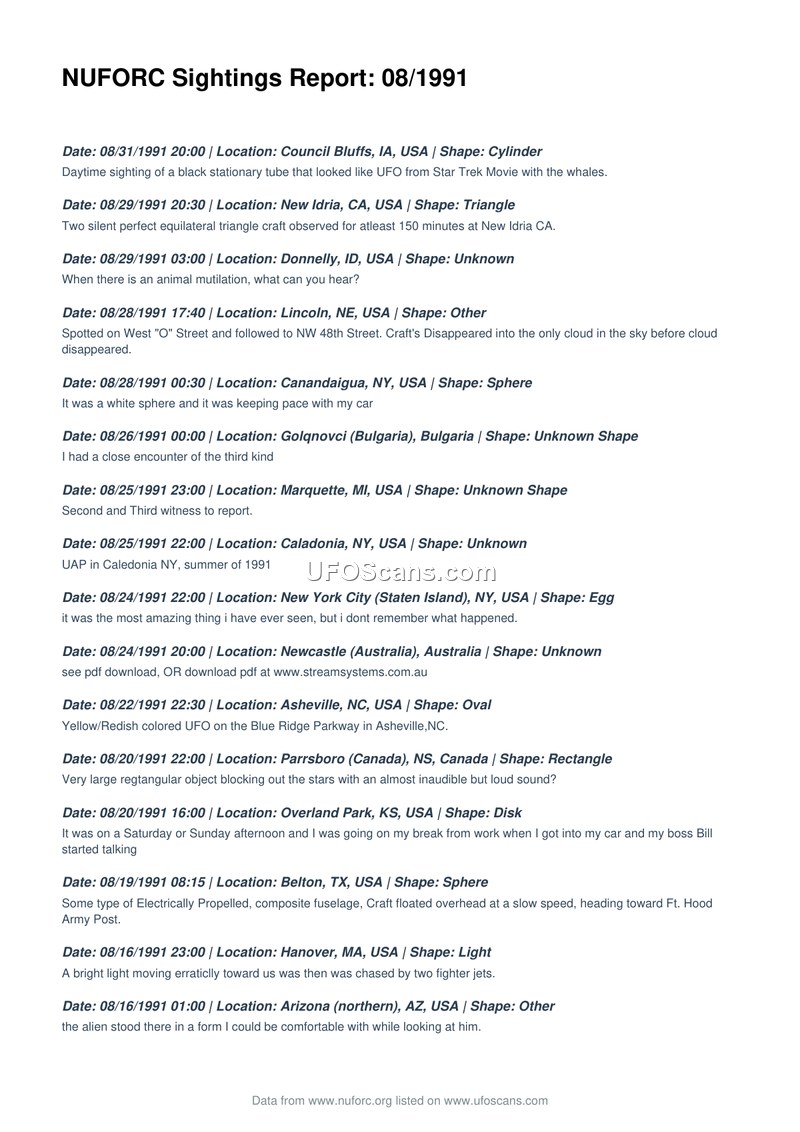 A monthly log of UFO sightings from August 1991, compiled by the National UFO Reporting Center. It contains dozens of individual reports from around the world detailing various aerial phenomena.