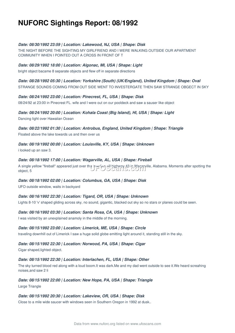 This document is a compilation of Unidentified Aerial Phenomena (UAP) sightings reported to the National UFO Reporting Center (NUFORC) during the month of August 1992. The report lists numerous individual accounts from various locations across the United States, the United Kingdom, Canada, and Spain. The sightings describe a wide variety of phenomena, including disks, triangles, spheres, fireballs, and unidentified lights. Witnesses report diverse experiences, ranging from silent hovering objects and high-speed maneuvers to interactions with 'men in black' and physical traces left at the scene. Many reports emphasize the unusual nature of the objects, such as their ability to move at right angles, emit intense light, or appear in formations. The document serves as a raw data log, capturing the subjective experiences of witnesses as they were reported to the organization. It includes specific details such as dates, times, locations, and brief descriptions of the events, providing a snapshot of public reports during this period.