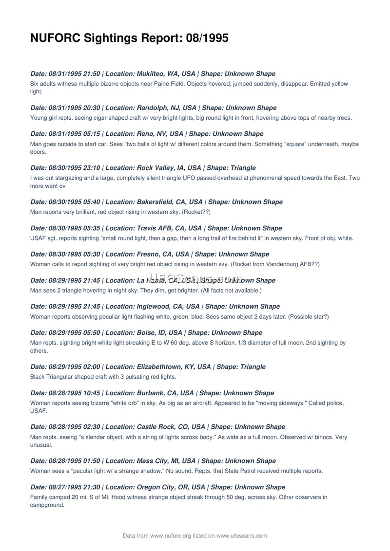 This document is a chronological log of UFO sightings reported to the National UFO Reporting Center during August 1995. It details hundreds of individual accounts from global witnesses describing various aerial phenomena.