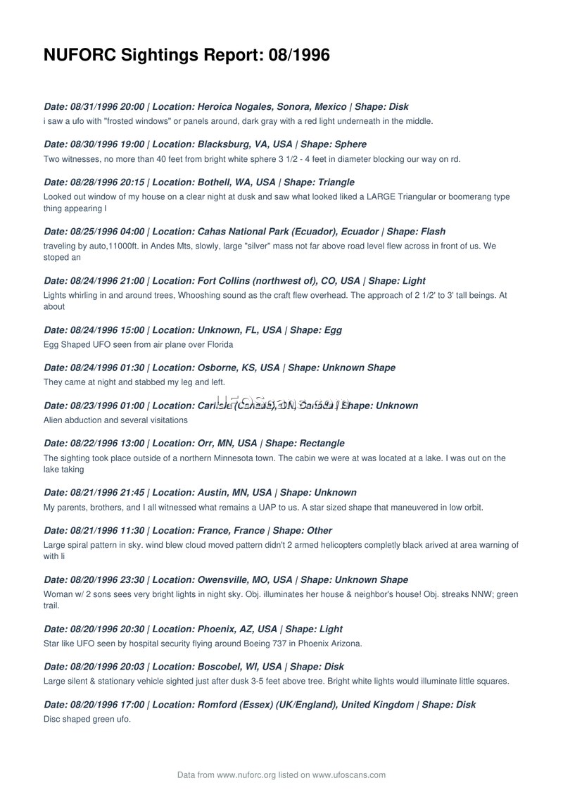 This document is a monthly compilation of UFO sightings reported to the National UFO Reporting Center in August 1996. It lists numerous global reports of aerial phenomena, ranging from simple light sightings to complex craft encounters and alleged abductions.